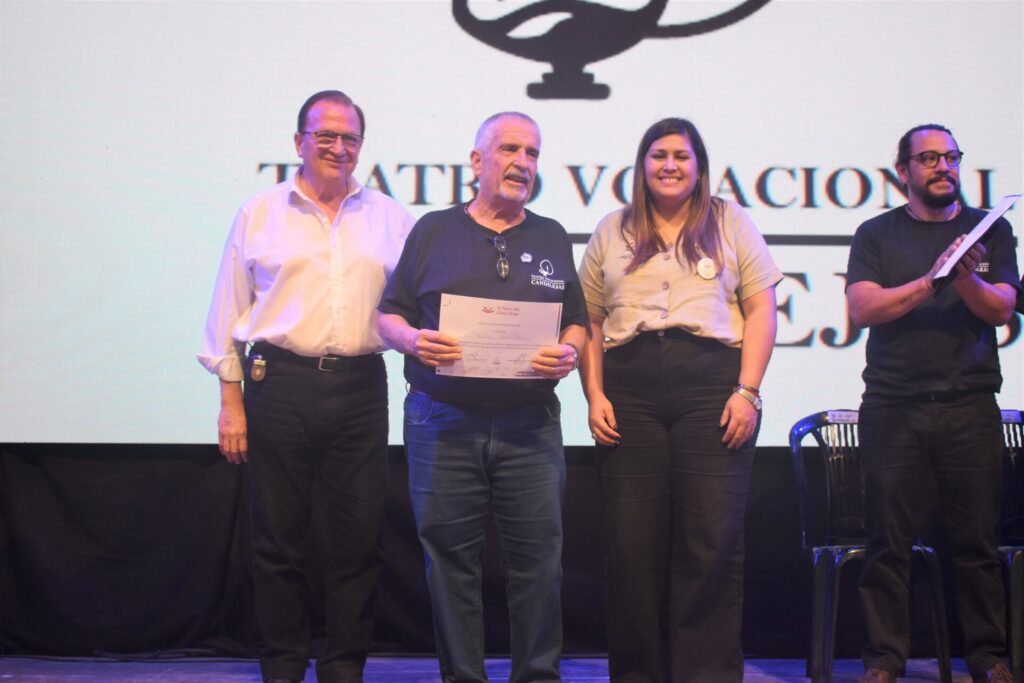 Al concluir la obra, la doctora Sonia Espina y Manuel “Lito” Zampar subieron al escenario para otorgar un merecido reconocimiento a Carlos Ginocchi por su destacada participación en la quinta edición de la Feria del Libro de Goya. Ambos representantes de la municipalidad expresaron su agradecimiento y reconocimiento a Ginocchi por su valioso aporte al mundo de la cultura y las artes en la región.