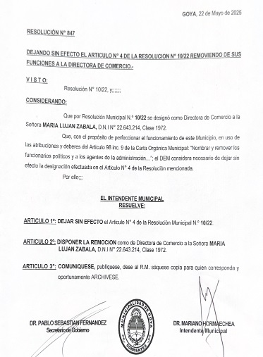 El intendente pidió la renuncia a María Lujan Zabala Directora de Comercio del municipio, el requerimiento efectuado al funcionario con los fines de un mejor ordenamiento del municipio, de acuerdo a lo que establece la Carta Orgánica Municipal, artículo 98, inciso 9.