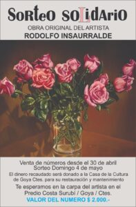 Sobre la donación, explicó que la obra titulada “El nuevo rosedal” se sorteará mediante una rifa que se pondrá a la venta al público desde el 30 de abril, y que hallará su futuro dueño el domingo 4 de mayo. Lo recaudado será destinado a refacciones en la Casa de la Cultura”.