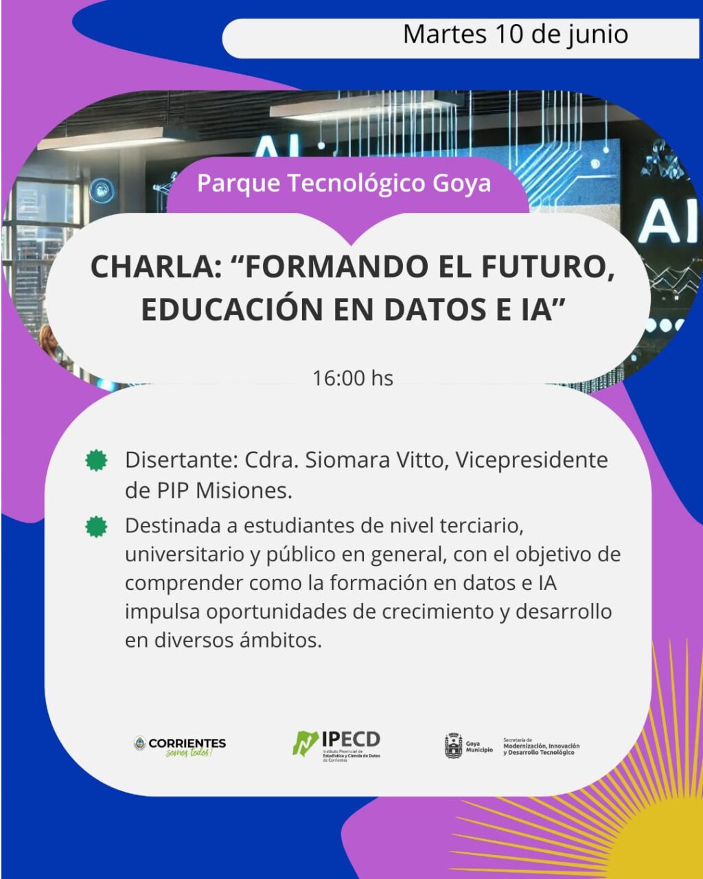 En primer lugar, la charla: “Formando el futuro, educación en datos e IA”. La cual se llevará a cabo el martes 10 de junio a partir de las 16 hs en el Parque Tecnológico Goya (Usina del Conocimiento), sito en avenida Neustadt y Mendoza.