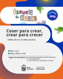 A partir del 5 de enero las Escuelas Municipales “Antonio R. Villarreal” y “Nuestra Señora de Itati” brindaran talleres en el marco de la escuela de verano en sus sedes educativas a niños y adolescentes de 6 a 12 y de 13 a 16 años, en sus diferentes perfiles.