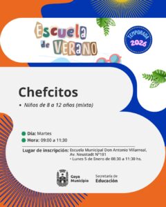 CHEFCITOS: Para niños y niñas de 6 a 12 años, los días martes de 9 a 11 y 30 horas, en la Escuela Antonio R Villarreal.
