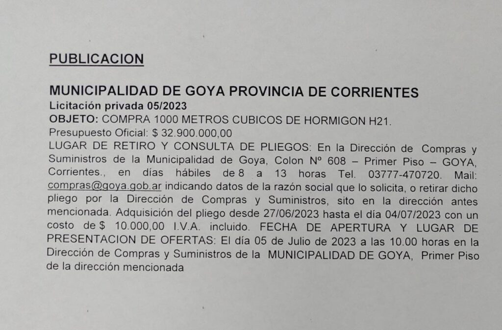 LUGAR DE RETIRO Y CONSULTA DE PLIEGOS: En la Dirección de Compras y Suministros de la Municipalidad de Goya, Colon Nº 608 – Primer Piso – GOYA, Corrientes., en días hábiles de 8 a 13 horas Tel. 03777-470720. Mail: [email protected] indicando datos de la razón social que lo solicita, o retirar dicho pliego por la Dirección de Compras y Suministros, sito en la dirección antes mencionada. Adquisición del pliego desde 27/06/2023 hasta el día 04/07/2023 con un costo de $10.000,00 I.V.A. incluido. FECHA DE APERTURA Y LUGAR DE PRESENTACIÓN DE OFERTAS: El día 05 de Julio de 2023 a las 10.00 horas en la Dirección de Compras y Suministros de la MUNICIPALIDAD DE GOYA, Primer Piso de la dirección mencionada.