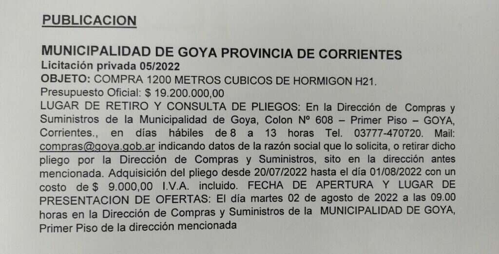 LUGAR DE RETIRO Y CONSULTA DE PLIEGOS: En la Dirección de Compras y Suministros de la Municipalidad de Goya, Colon N° 608- Primer Piso- GOYA, Corrientes, en días hábiles de 8 a 13 horas. Tel. 03777-470720. Mail: [email protected] indicando datos de la razón social que lo solicita, o retirar dicho pliego por la Dirección de Compras y Suministros, sito en la dirección antes mencionada. Adquisición del pliego desde 20/07/2022 hasta el día 01/08/2022 con un costo de $9.000,00 I.V.A. incluido. FECHA DE APERTURA Y LUGAR DE PRESENTACIÓN DE OFERTAS: El día martes 02 de agosto de 2022 a las 09.00 horas en la Dirección de Compras y Suministros de la MUNICIPALIDAD DE GOYA, Primer Piso de la dirección mencionada.