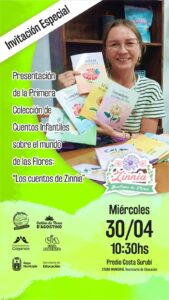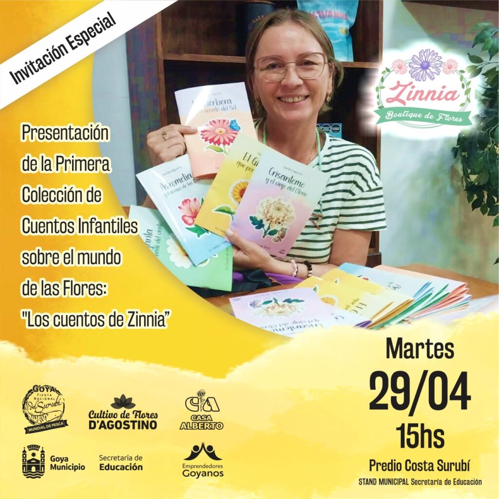 El próximo martes 29 de abril a las 15 hs en el predio Costa Surubí, en el Stand Institucional, la Secretaría de Educación presenta a la florista Sandra Aguirre, reconocida en nuestra región por su amor y dedicación al mundo natural, quien oficialmente pondrá a consideración su primera colección de cuentos infantiles: “Los Cuentos de Zinnia”.