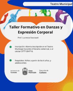 Zampar explicó que continúan las convocatorias para el ciclo anual de formación artística: “Realizando las distintas convocatorias para todo lo que es el desarrollo anual de los distintos talleres, como el caso del taller formativo en danza y expresión corporal que está a cargo de la profesora Lucrecia Stacciuoli, se está haciendo ya las inscripciones en el Teatro Municipal o al teléfono que es el 3777- 304716”.