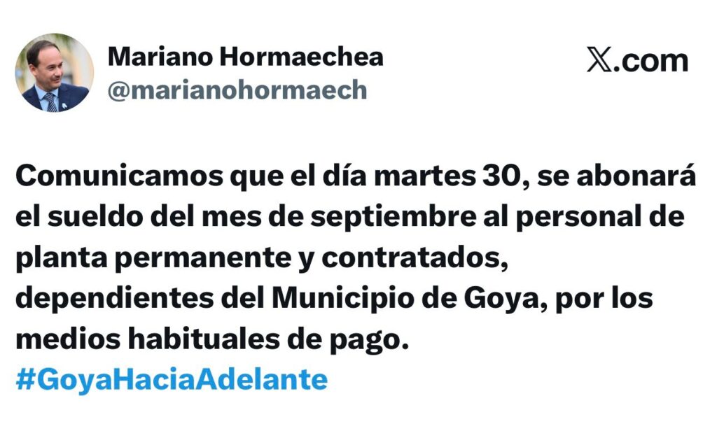En su mensaje, el jefe comunal de Goya comunicó: “Comunicamos que el día martes 30, se abonará el sueldo del mes de septiembre al personal de planta permanente y contratados, dependientes del Municipio de Goya, por los medios habituales de pago. #GoyaHaciaAdelante