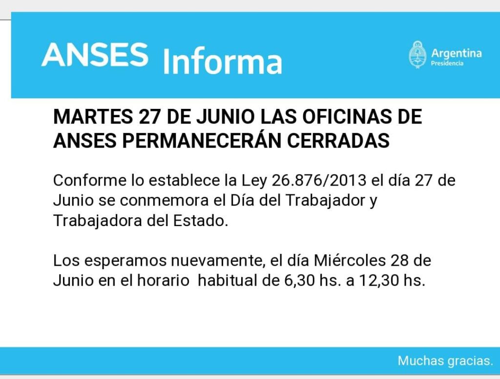 Con motivo de conmemorarse el Día del Trabajador y Trabajadora del Estado, el próximo martes 27 de junio las oficinas de la UDAI- ANSES Goya permanecerán cerradas al público.