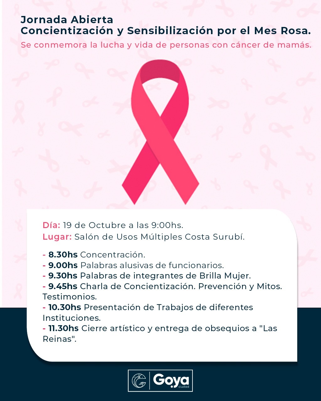 En el marco de las actividades orientadas hacia la sensibilización y concientización sobre el cáncer de mama, este jueves 19 la Municipalidad organiza una jornada abierta, informativa, un espacio de escucha y de testimonios en el Salón de Usos Múltiples de Costa Surubí a las 9 horas.