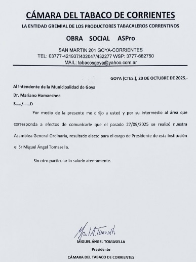 La Cámara del Tabaco de Corrientes, entidad gremial que representa a los productores tabacaleros de la provincia, realizó su Asamblea General Ordinaria el pasado sábado 27 de septiembre, donde se eligieron nuevas autoridades. Miguel Ángel Tomasella asumirá la presidencia para el próximo período.