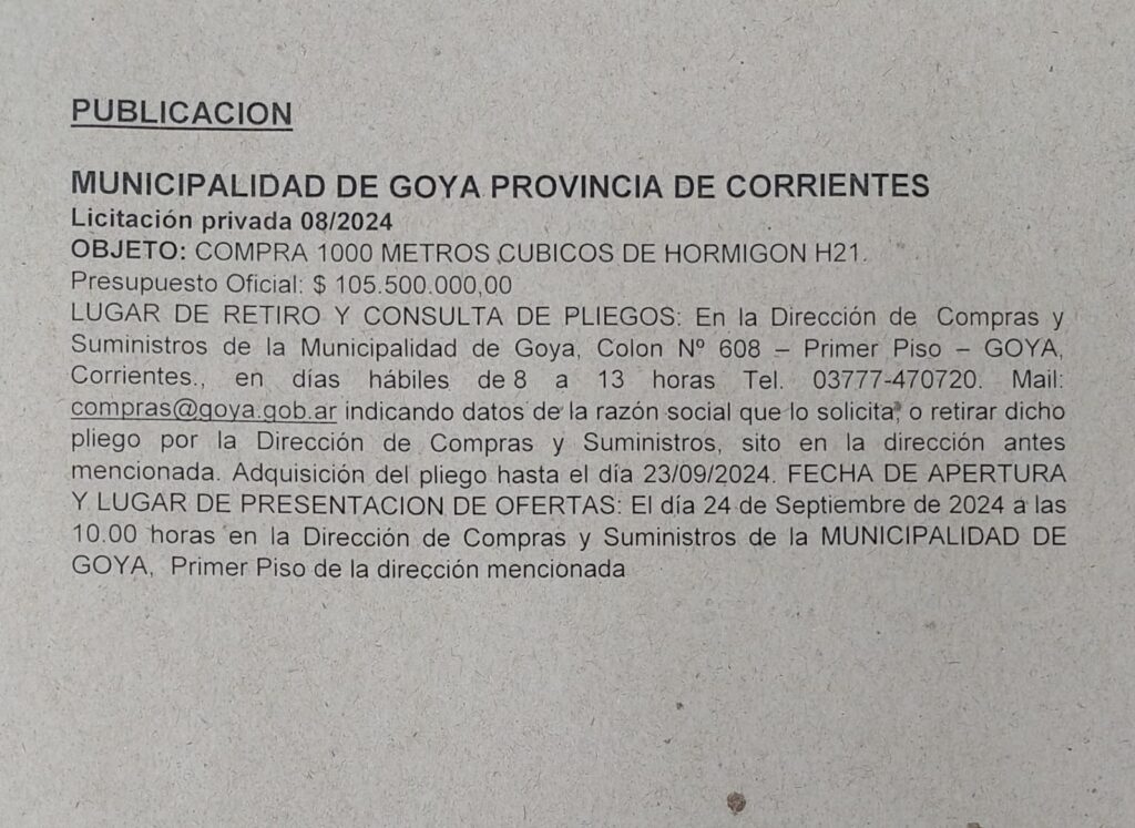 LUGAR DE RETIRO Y CONSULTA DE PLIEGOS: En la Dirección de Compras y Suministros de la Municipalidad de Goya, Colon Nº 608 – Primer Piso – GOYA, Corrientes., en días hábiles de 8 a 13 horas Tel. 03777-470720. Mail: [email protected] indicando datos de la razón social que lo solicita, o retirar dicho pliego por la Dirección de Compras y Suministros, sito en la dirección antes mencionada. Adquisición del pliego hasta el día 23/09/2024. FECHA DE APERTURA Y LUGAR DE PRESENTACIÓN DE OFERTAS:
