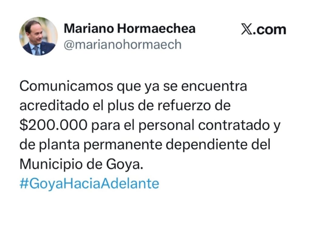 En su mensaje, el primer mandatario de la ciudad expresó: “Comunicamos que ya se encuentra acreditado el plus de refuerzo de $200.000 para el personal contratado y de planta permanente dependientes del Municipio de Goya. #GoyaHacia Adelante”.