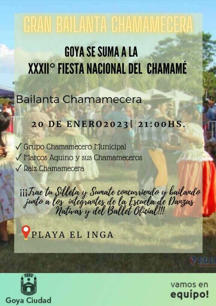 El Director de Cultura Manuel Zampar, en relación a la programación del fin de semana, anticipó: “Un cierre de año con chamamé y una apertura con esta bailanta, uno recuerda la caravana chamamecera que partió en el norte y finalizó en el sur de nuestra ciudad. Desde el Instituto de Cultura solicitaron la adhesión en los municipios para que la fiesta se viva en todo el territorio provincial, por eso desde Goya, previendo la visita de turistas por nuestra ciudad, nos parece bueno que cuenten con ese espacio en El Inga”.