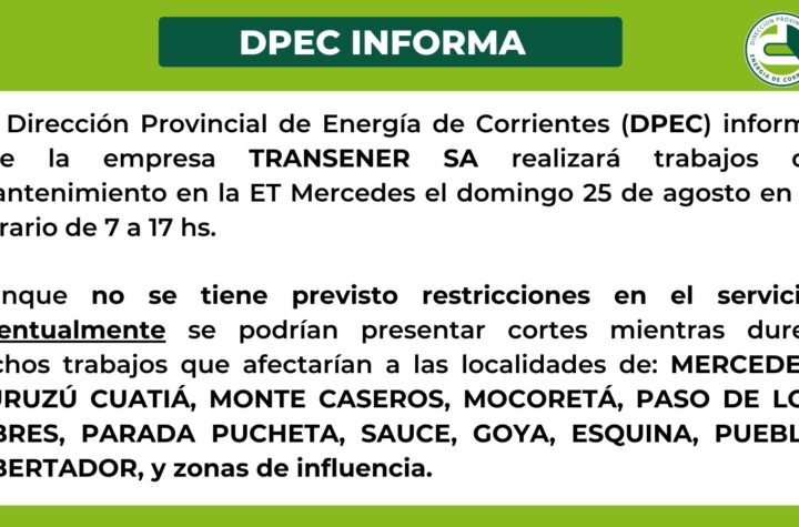 Generales LA DPEC INFORMA TRABAJOS DE MANTENIMIENTO DE TRANSENER SA Y PODRÍA AFECTAR A GOYA 1 año atras