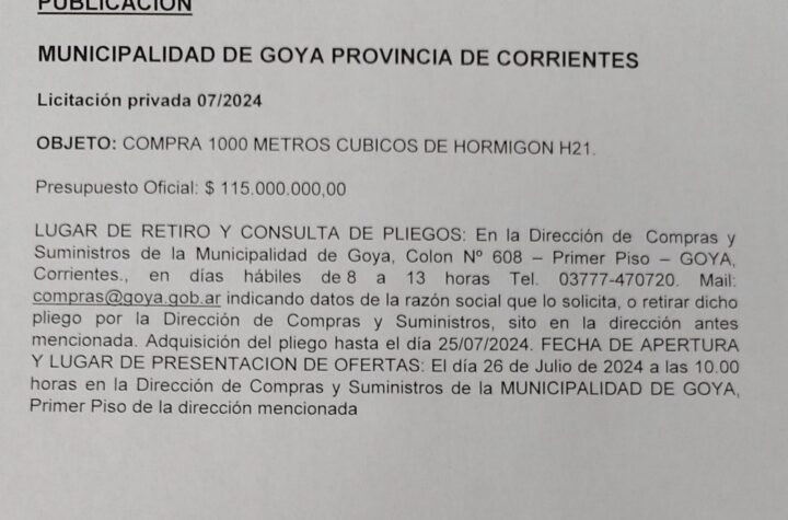 Generales Locales MUNICIPALIDAD DE GOYA PROVINCIA DE CORRIENTES: LICITACIÓN PRIVADA 07/2024 1 año atras