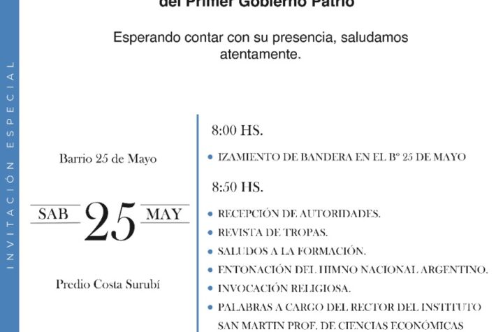 Espectáculos Locales LA MUNICIPALIDAD INVITA AL ACTO CONMEMORATIVO DEL 214º ANIVERSARIO DE LA CONSTITUCIÓN DEL PRIMER GOBIERNO PATRIO 2 años atras