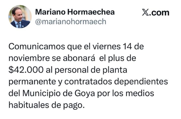 Locales EL MUNICIPIO DE GOYA ABONARÁ ESTE VIERNES EL PLUS DE $42.000 A EMPLEADOS MUNICIPALES 5 días atras
