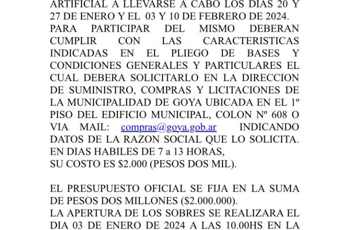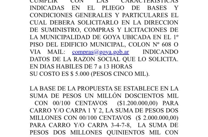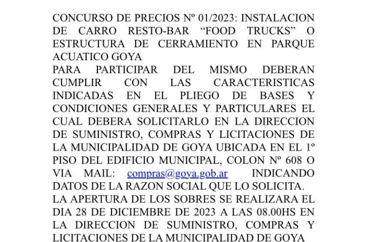 Generales Locales CONCURSO DE PRECIOS Nº 01/2023: INSTALACIÓN DE CARRO RESTO-BAR “FOOD TRUCKS” O ESTRUCTURA DE CERRAMIENTO EN PARQUE ACUÁTICO GOYA 2 años atras