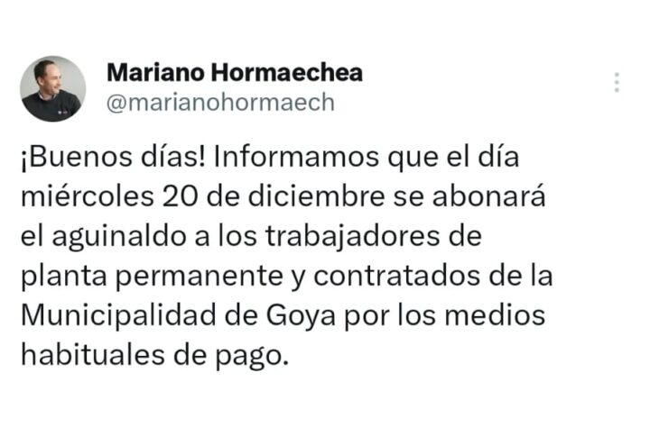 Generales Locales SE EFECTUARÁ EL PAGO DEL AGUINALDO A TRABAJADORES DE PLANTA PERMANENTE Y CONTRATADOS DEL MUNICIPIO DE GOYA 2 años atras