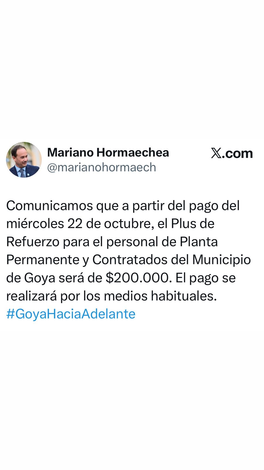 En sus redes, informa: “Comunicamos que, a partir del pago del miércoles 22 de octubre, el Plus de Refuerzo para el personal de Planta Permanente y Contratados del Municipio de Goya será de