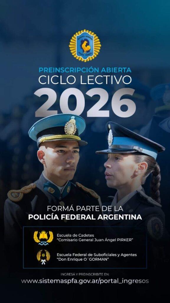 Se encuentran abiertas las inscripciones para el proceso de selección e incorporación del personal a esta institución para el ciclo lectivo año 2026, como aspirante a Cadete en la Escuela de Cadetes “Comisario General Juan Ángel Pirker” y aspirante a Agente en la Escuela Federal de Suboficiales y Agentes “Don Enrique O’Gorman”, los que se deben realizar a través del nuevo portal de ingresos, accediendo por el sitio web: https://www.sistemaspfa.gov.ar/portal_ingresos/