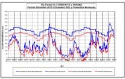 Actualmente se observa en fase de descenso, con niveles próximos a 3,30 metros en rango de aguas medias a medias bajas. El promedio mensual en Corrientes: 4,05 metros, resultando 0,62 metros superior al promedio de noviembre desde 1997. De acuerdo a las previsiones meteorológicas y a la operación de embalses emplazados en el tramo superior, continuará descendiendo. Se espera que el caudal base disminuya levemente, con valores en rango de aguas medias-bajas o bajas, y que los valores de punta se sitúen en rango de aguas medias-bajas.