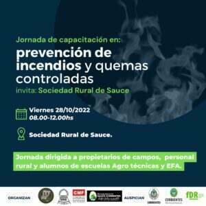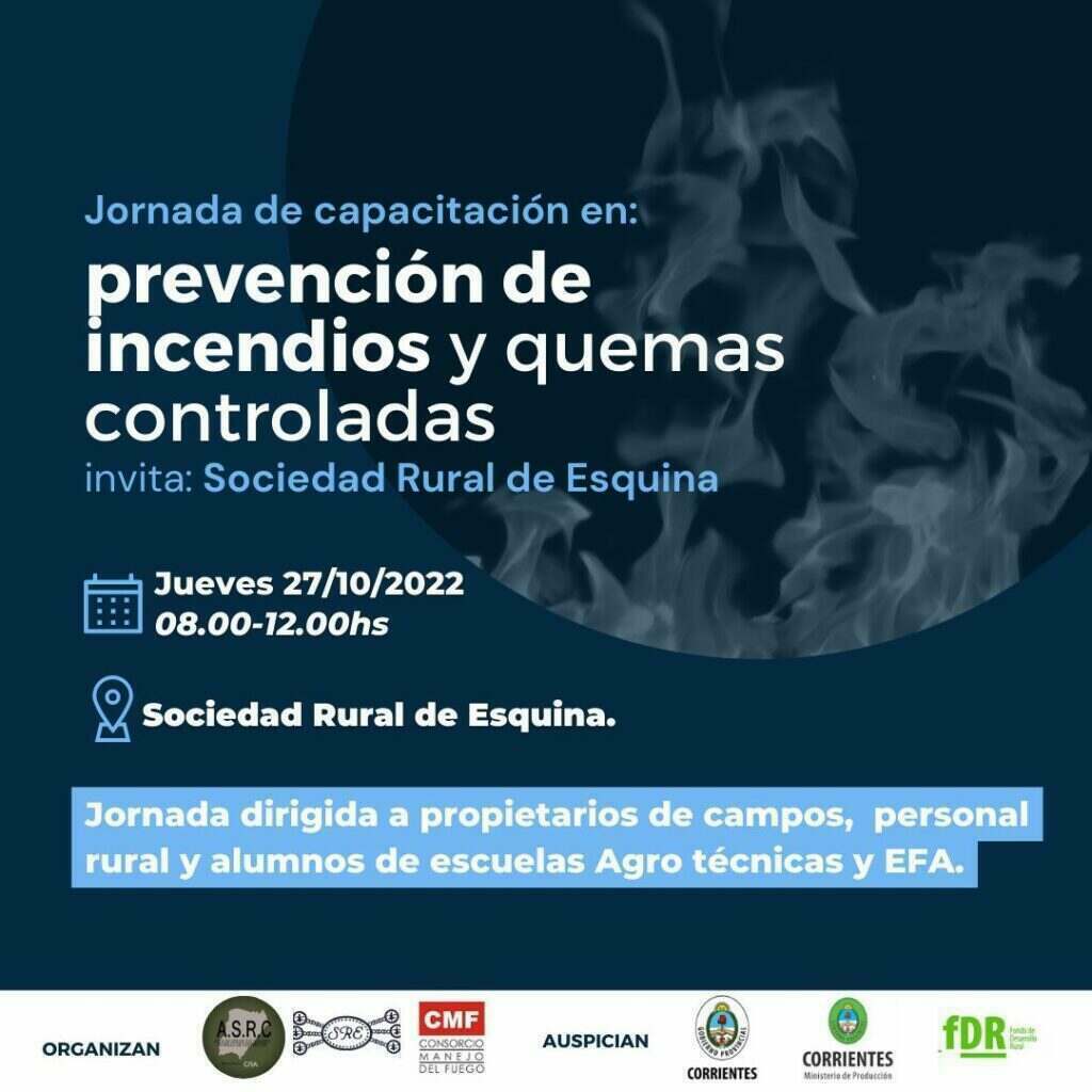 Desde Asociación de Sociedades Rurales de Corrientes y el Consorcio del Manejo del Fuego, informan que se estarán desarrollando dos nuevas jornadas de “prevención de incendios y quemas controladas”, los días jueves 27 y viernes 28, en las ciudades de Esquina y Sauce respectivamente.