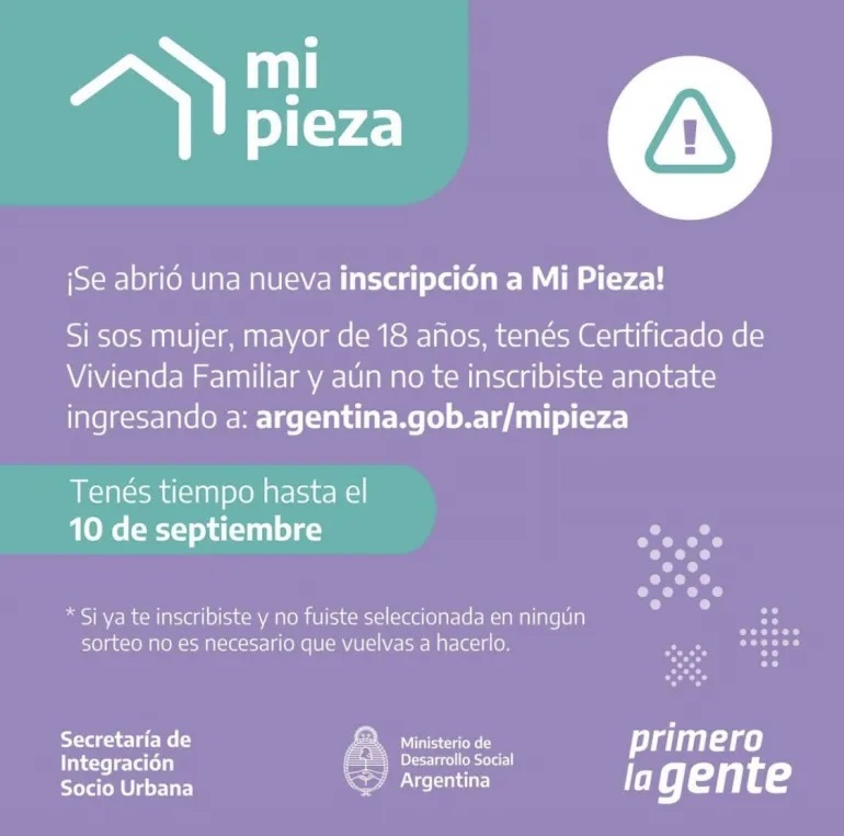 REQUISITOS Y FECHAS: HABILITAN LA INSCRIPCIÓN AL PROGRAMA MI PIEZA