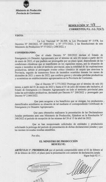 En la parte resolutiva, dispone lo siguiente: El Ministro de Producción Resuelve Prorrogar por el periodo comprendido desde el 2 al 28 de febrero de 2023, el plazo para la presentación con carácter de declaración jurada las solicitudes, de Declaración de Emergencia y/o Desastre Agropecuario, por parte de las personas físicas y jurídicas comprendidas en el alcance del Decreto 200/2022.