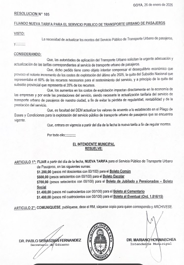 ARTÍCULO 1°: FIJAR a partir del día de la fecha, NUEVA TARIFA para el Servicio Público de Transporte Urbano de Pasajeros, en las siguientes sumas: