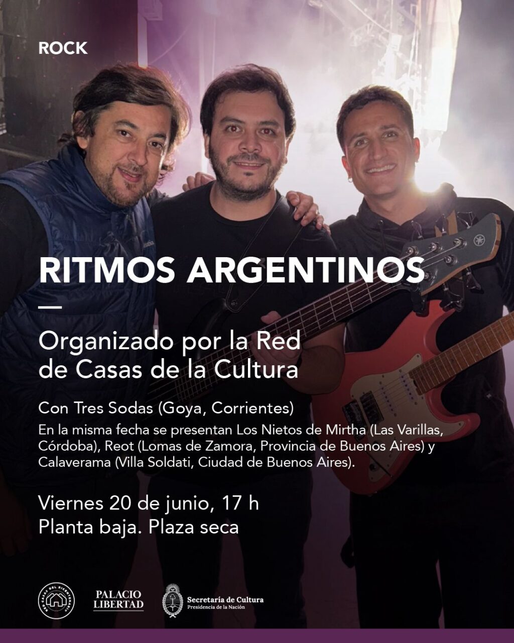 La Banda de nuestra ciudad “Tres Sodas” se presentará el viernes 20 a las 17 horas en Planta Baja, Plaza Seca. Por segundo año consecutivo, la Red de Casas de la Cultura lleva adelante la propuesta Ritmos Argentinos, que ofrece una fusión de ritmos.
