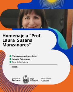 Sábado 7: Desde las 20,30 horas, homenaje a la profesora Susana Manzanares con un encuentro artístico musical: “Voces Cantan al atardecer”; con interpretaciones de artistas de la Dirección de Cultura.