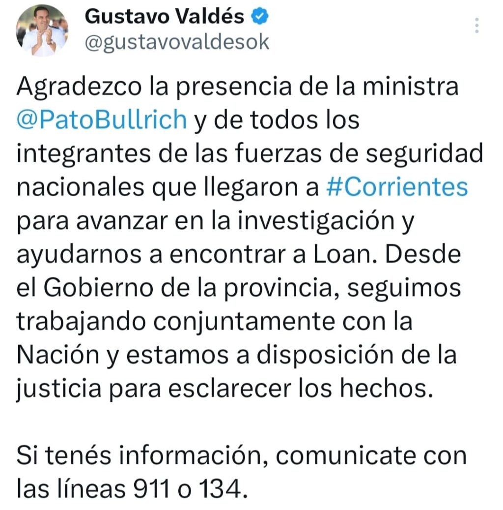 De este modo, Valdés expresó: “Agradezco la presencia de la ministra Patricia Bullrich y de todos los integrantes de las fuerzas de seguridad nacionales que llegaron a Corrientes para avanzar en la investigación y a ayudarnos a encontrar a Loan. Desde el Gobierno de la provincia seguimos trabajando conjuntamente con la Nación y estamos a disposición de la Justicia para esclarecer los hechos”.