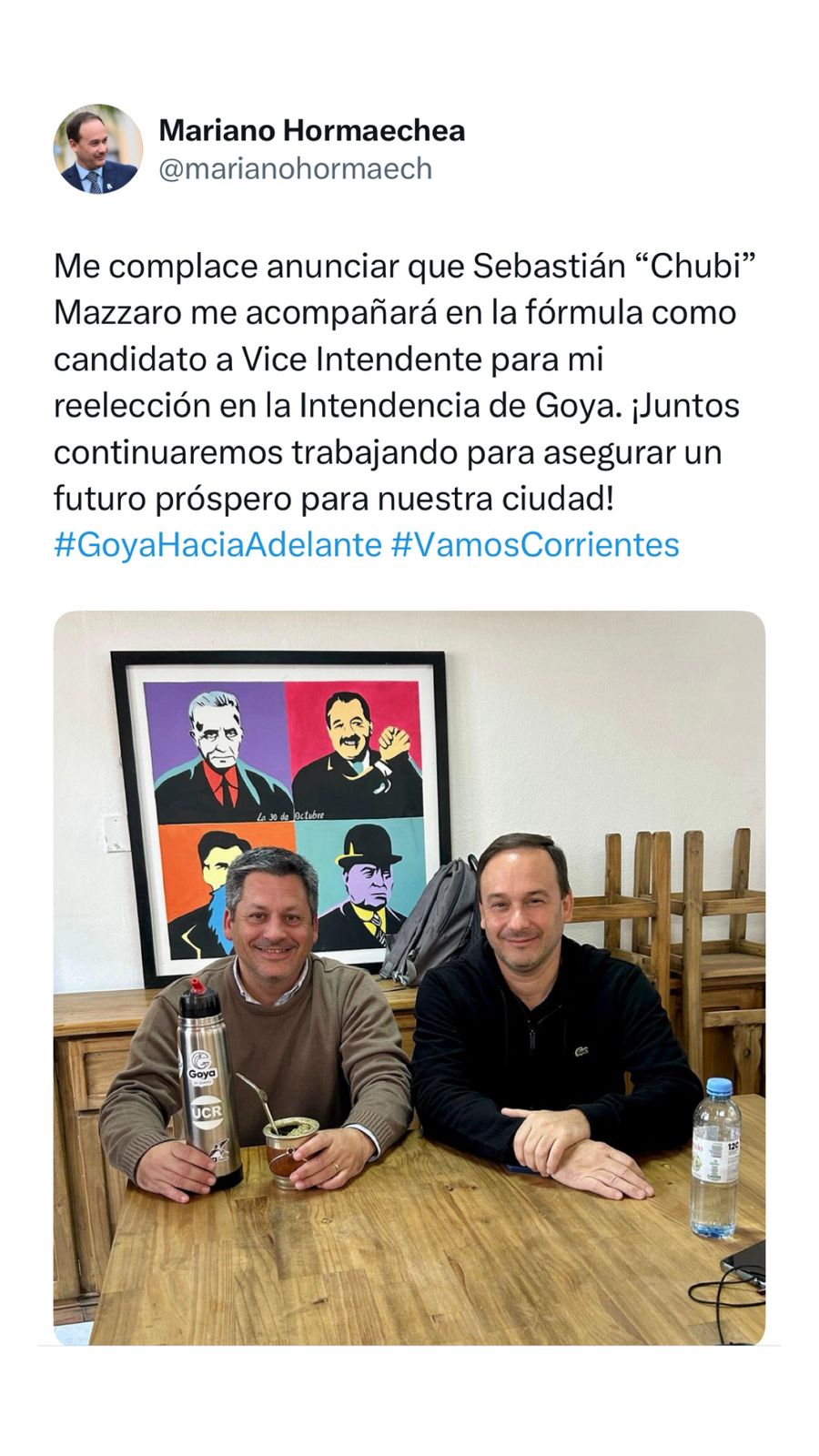 En un mensaje a través de sus redes el intendente Mariano Hormaechea confirmo que Sebastian Mazzaro lo acompaña como candidato a vice intendente.